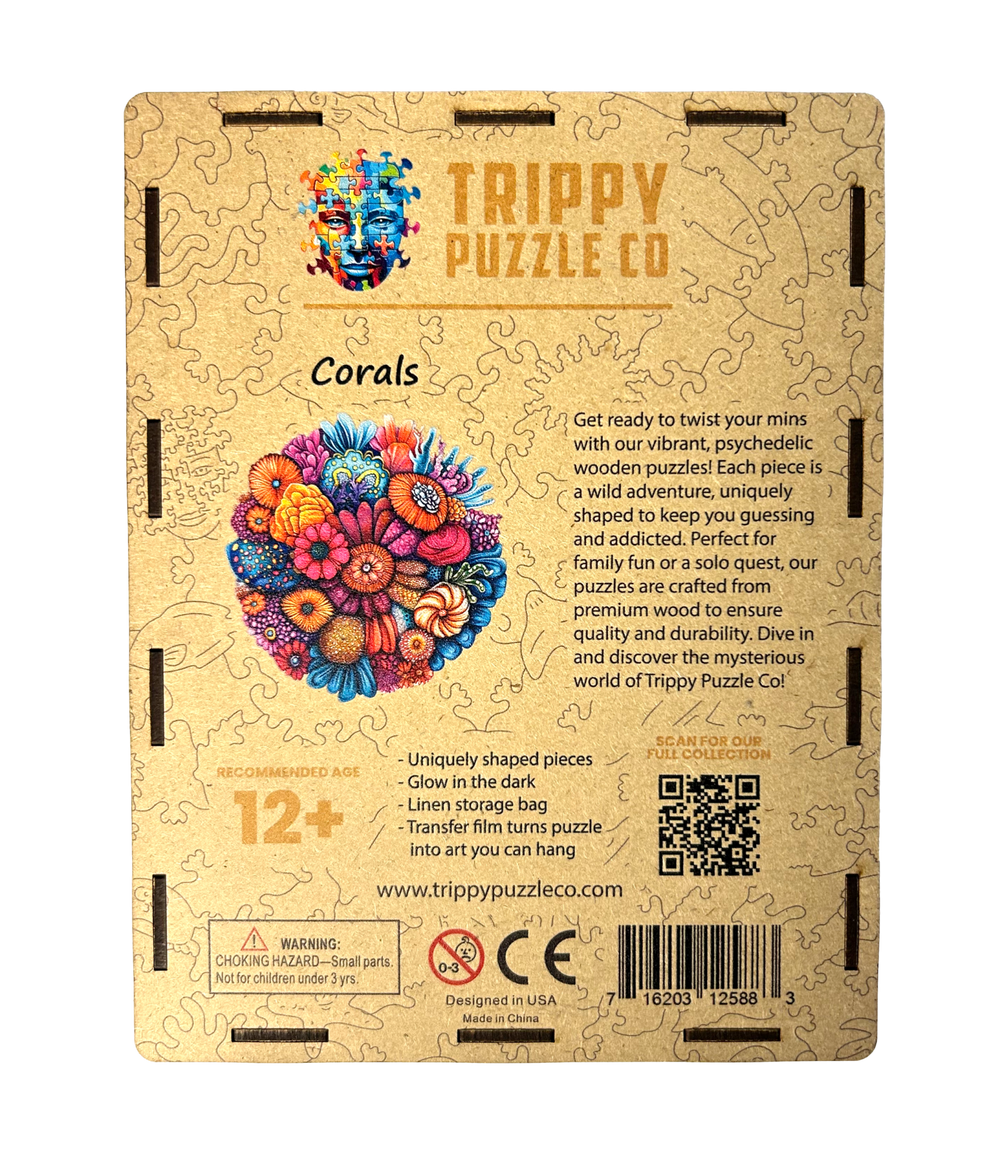 Dive into a burst of underwater color with Corals, a 300-piece wooden jigsaw puzzle from Trippy Puzzle Co. 🐠🌈 Inspired by the lively shapes and hues of a thriving coral reef, this uniquely shaped puzzle is filled with swirling forms, organic textures, and an explosion of vibrant tones. From fiery oranges and pinks to tropical blues and seafoam greens, each intricately cut piece celebrates the wild beauty of the ocean’s hidden gardens.