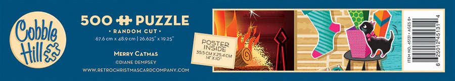 Celebrate the holidays with mischievous feline cheer in the Cobble Hill Merry Catmas 500 piece jigsaw puzzle! 🎄🐱✨ This festive picture puzzle bursts with playful black cats climbing stockings, decorating the tree, and causing delightful chaos around a glowing fireplace. With bright retro colors, cozy holiday décor, and charming artwork by Diane Dempsey, this colorful jigsaw puzzle is perfect for anyone who loves cat jigsaw puzzles, beautiful puzzles, and jigsaw puzzle games that bring joy to the season.