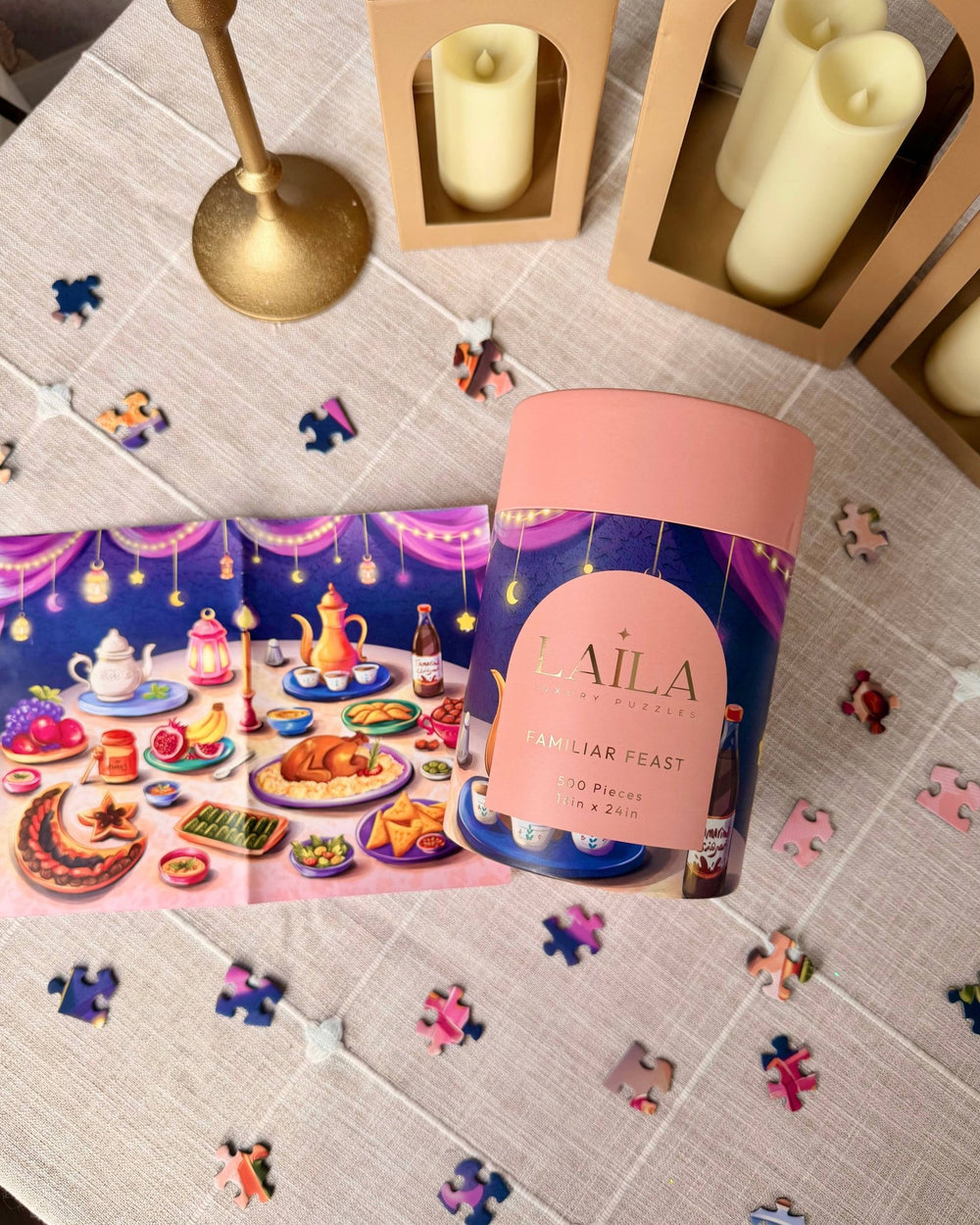Gather around the table and savor the moment with Familiar Feast, a richly illustrated 500 piece jigsaw puzzle glowing with warmth, tradition, and togetherness ✨🕯️. Beneath soft string lights and hanging lanterns, a candle-lit table overflows with beloved dishes and comforting flavors, inviting you to slow down and enjoy every detail. Inspired by the spirit of Ramadan and shared meals, this beautiful puzzle captures the joy of gathering with family and friends. Egyptian artist Rawda Salah brings this picture puzzle to life with vibrant colors and nostalgic charm, transforming familiar traditions into an inviting scene meant to be enjoyed piece by piece.