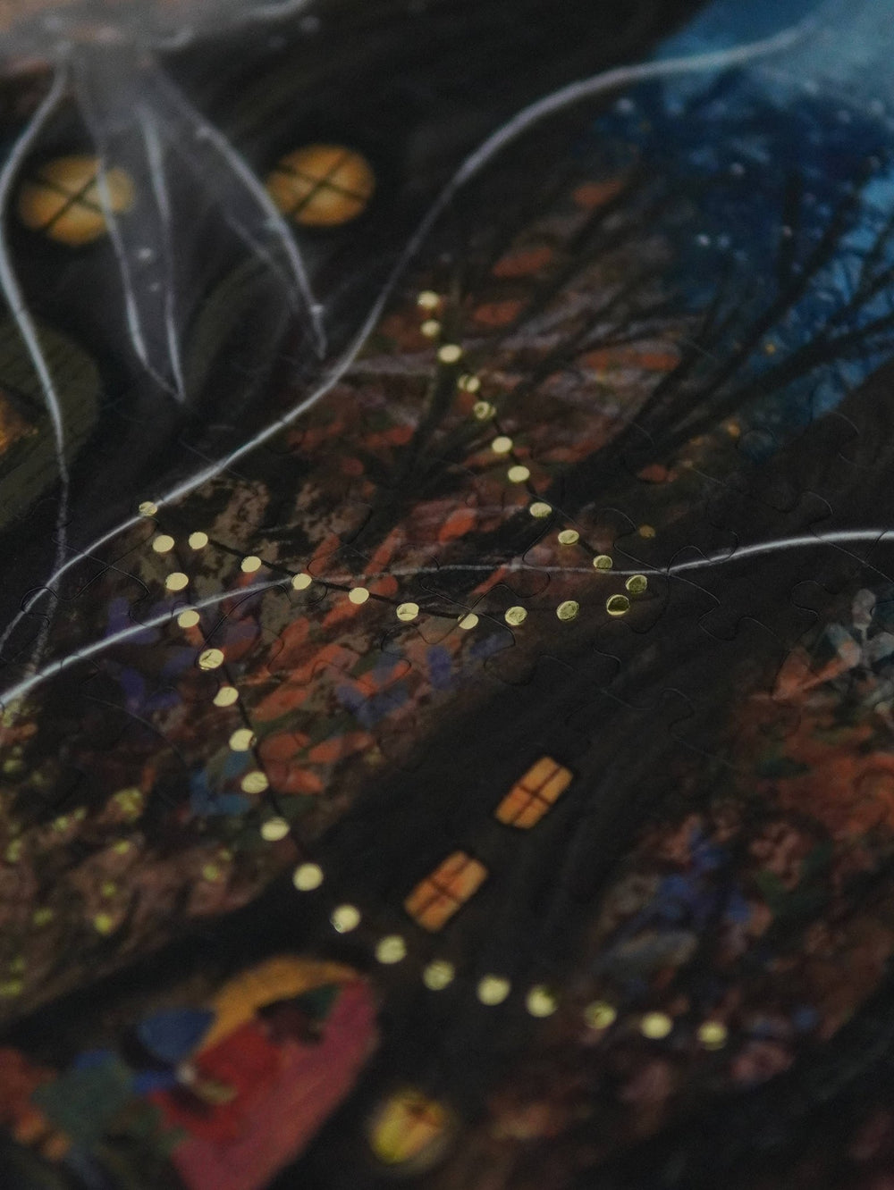Fairywood is rich with themes of magical forests, whimsical autumn scenery, lantern-lit pathways, woodland homes, gentle spirits, and imaginative storytelling. The glowing night sky, warm earthy tones, and bustling tiny characters create a charming world brimming with fantasy and nostalgia—perfect for lovers of atmospheric, storybook-style jigsaw puzzles.