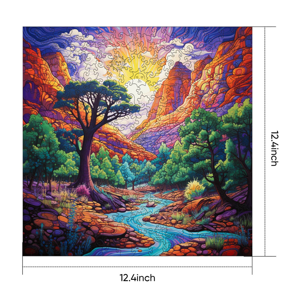Find your calm in a canyon of color with Zion Zen, a 300-piece wooden jigsaw puzzle from Trippy Puzzle Co. 🌄✨ This stunning artwork transforms a serene canyon landscape into a radiant, dreamlike escape—glowing red rock walls frame a peaceful river winding through lush greenery, all beneath a brilliant sun bursting with swirling, meditative patterns. Shades of gold, violet, teal, and amber blend into a breathtaking visual flow that feels both energizing and deeply soothing.