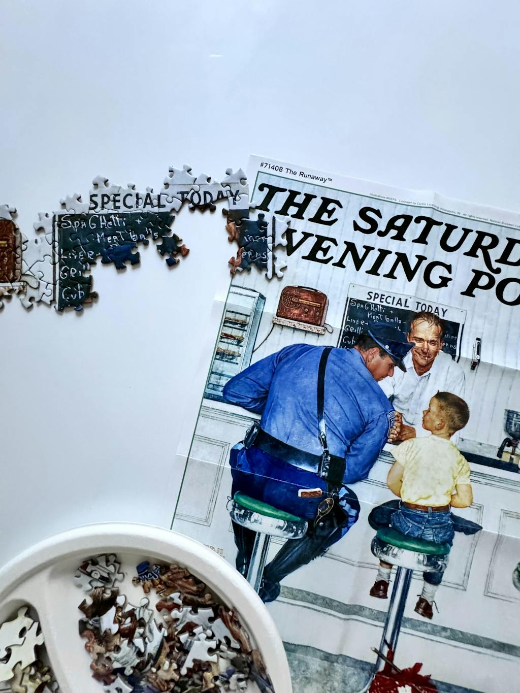 Step back into the heartwarming world of Norman Rockwell with this charming 1000-piece jigsaw puzzle, showcasing one of his most beloved illustrations, The Runaway. Featured on the cover of The Saturday Evening Post, this nostalgic scene captures the innocence of a little boy who decides to run away from home, but not before stopping by the local diner for a quick soda and a heart-to-heart with a kind police officer.