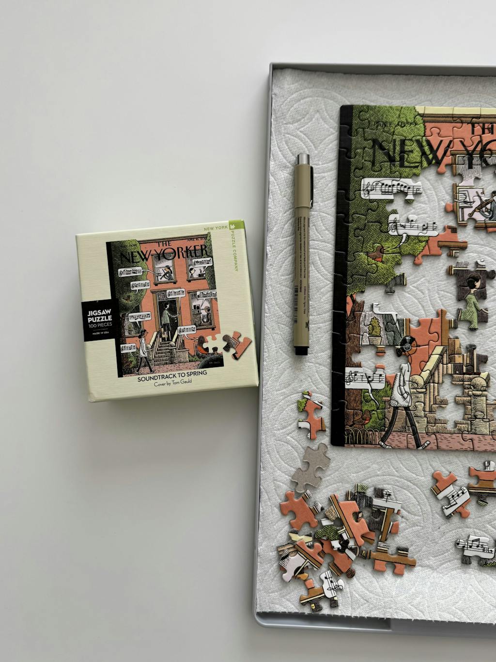 Feel the rhythm of the season with the Soundtrack to Spring Mini 100 Piece Jigsaw Puzzle by New York Puzzle Company! 🎶 Based on the New Yorker cover from April 16, 2018, by artist Tom Gauld, this whimsical jigsaw puzzle celebrates the joyful sounds of springtime in the city. From chirping birds to music drifting from open windows, each puzzle piece captures the harmony between nature and urban life. With its soft pastel tones and charming illustration style, this mini puzzle brings a soothing touch of spring to your puzzling table.
